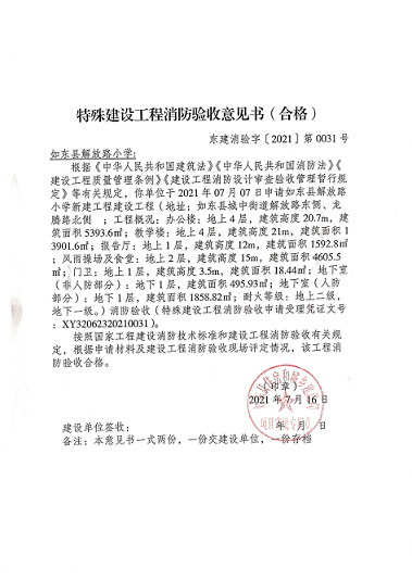 7月9日,解放路小学组织消防验收;7月12日,会同规划部门通过查看现场顺利通过规划验收;7月16日,顺利取得消防验收合格意见书;7月22日,完成竣工验收。